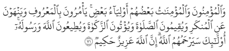 Which means: “The believing men and believing women are allies of one another. They enjoin what is right and forbid what is wrong, and establish prayer and give zakah, and obey Allah and His Messenger. Those are the ones whom Allah will have mercy upon. Indeed, Allah is Almighty and All-Wise.”