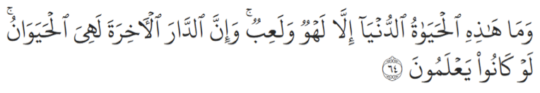 Yang bermaksud: “Dan kehidupan dunia ini tidak lain hanyalah permainan dan hiburan semata-mata. Dan sesungguhnya akhirat jualah kehidupan yang sebenar, sekiranya mereka mengetahui.”