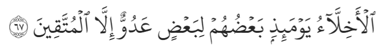 Yang bermaksud: “Pada hari itu, sahabat-sahabat karib sesetengahnya akan menjadi musuh kepada yang lain, kecuali orang-orang yang persahabatannya berdasarkan takwa (yakni