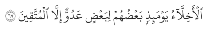 Which means: “On that day, some close friends will become enemies to one another, except for those whose friendship is based on taqwa (faith and righteous deeds).”